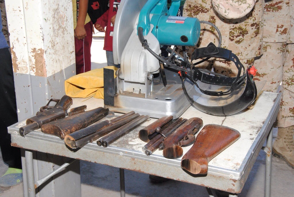 Hermosillo, Sonora, 7 de marzo de 2014.- Decenas de alumnos de la escuela primaria “22 de Septiembre”, ubicada en el poblado Miguel Alemán, atestiguaron la destrucción de dos rifles calibre .22 y 30-30, que padres de familia cambiaron por vales de despensa en el arranque de la campaña de canje de armas de fuego 2014.