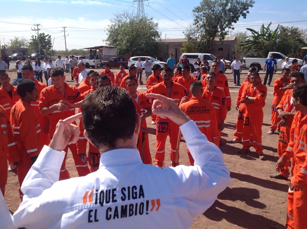 Desde muy temprana hora,internos del Centro de prevención y Readaptación social se incorporaron a las tareas de desmonte y recolección de basura,para trabajar de manera coordinada con servidores públicos de la Dependencia,en el trazo y posterior rehabilitación del campo de fútbol soccer para los niños y jóvenes,con sus bancas pintadas.Fue aquí donde Ernesto Munro tiró el penal inaugural del mismo,a petición de los jóvenes Cajemenses,por otra parte el Secretario respondió positivo para la eventual entrega de uniformes deportivos.En estas jornadas también entregó un aparato de refrigeración y otras peticiones del plantel educativo en Cócorit.