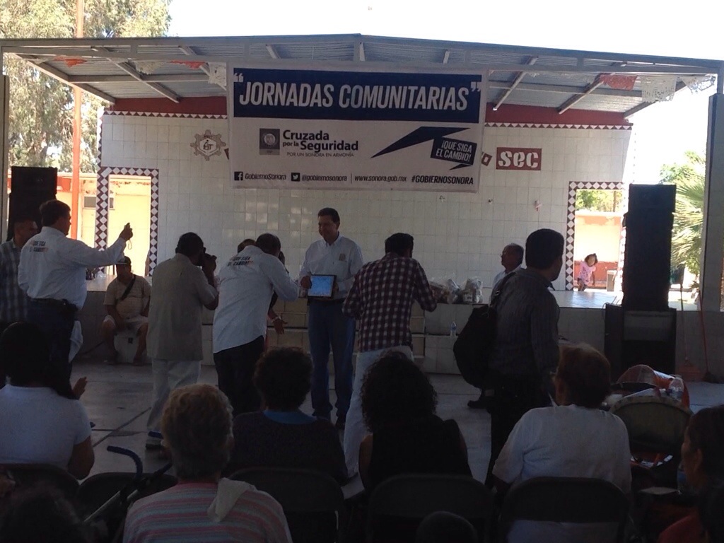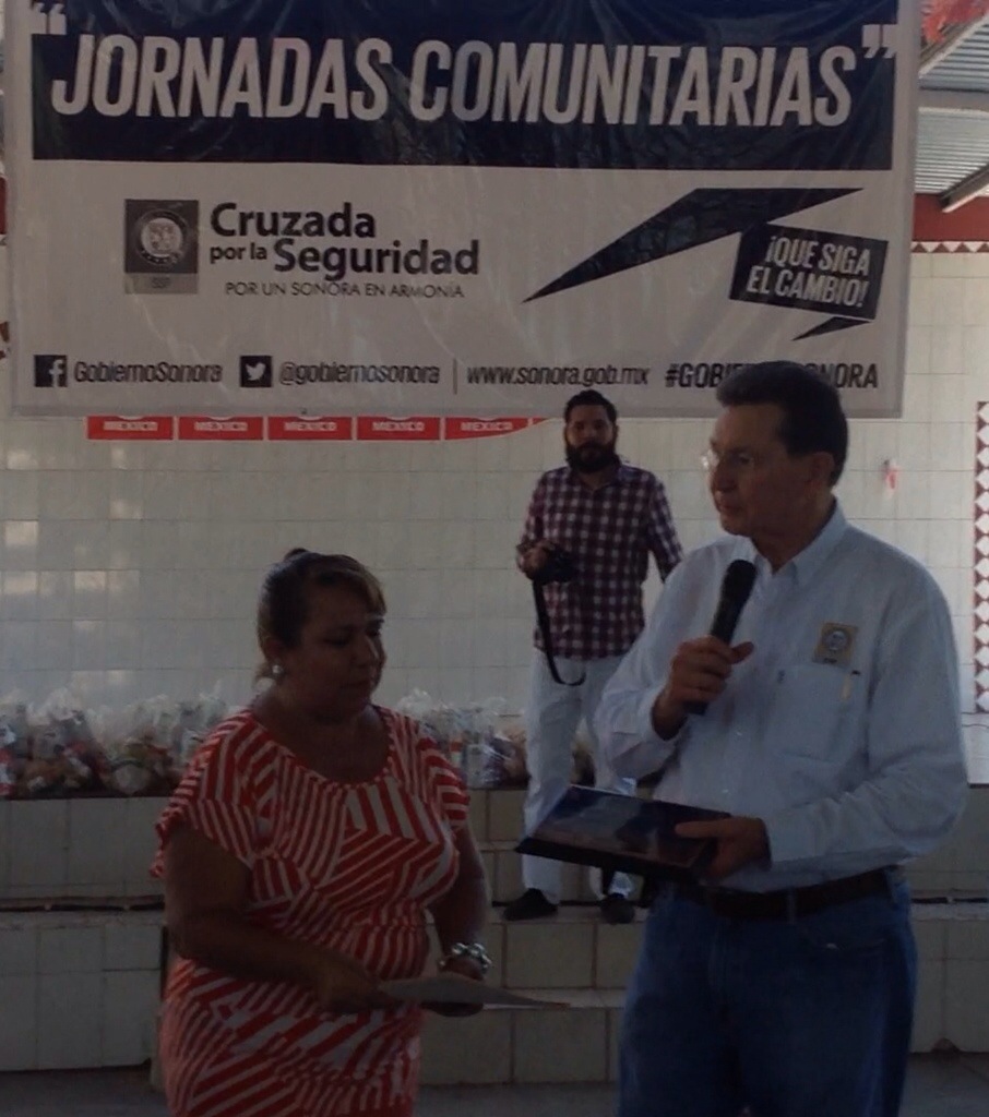 Entrega directora de plantel educativo en Puerto peñasco al Lic.Ernesto Munro Palacio secretario de seguridad pública por su valioso apoyo un merecido reconocimiento,ante más de mil personas asistentes a las #JornadasDeLaComunidad en la cual se ofrecieron diversos servicios de dependencias estatales,al dar un mensaje del gobernador del Estado Guillermo Padrés en el sentido de dar el extra y en lugar de quedarse los fines de semana descansando en su casa y atender a la gente,en este caso a los rocaportenses.