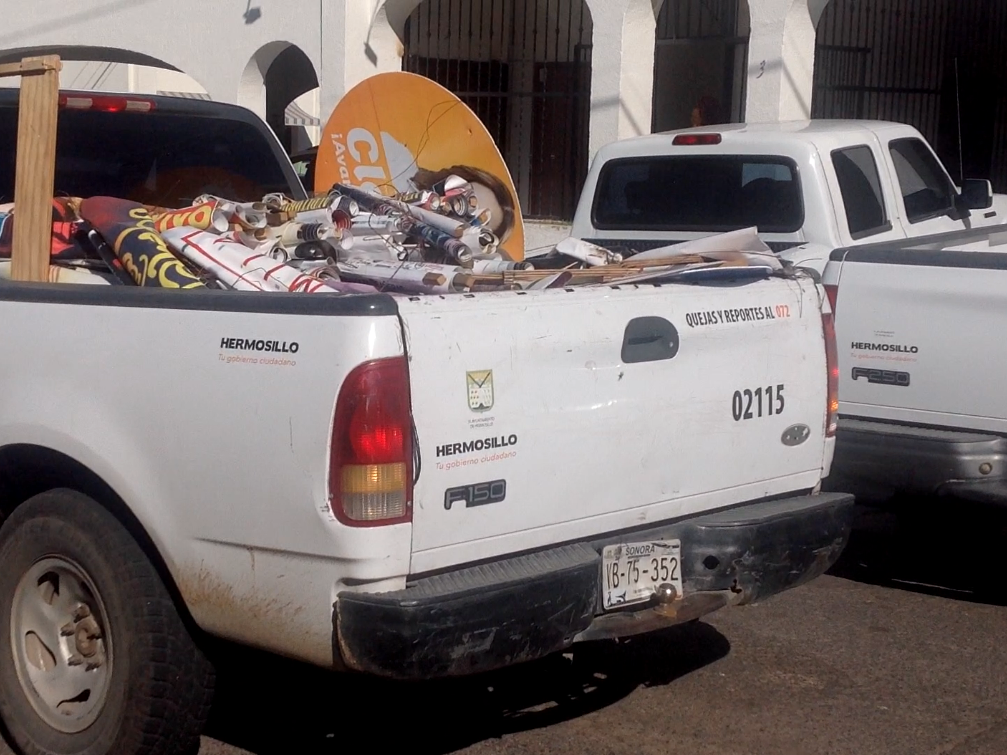 Cientos de Pendones fueron retirados de las calles de la Ciudad de #Hermosillo,por el gobierno que encabeza Alejandro López Caballero debido a la aprobación de un acuerdo en el Cabildo la semana anterior,donde se obligaría a quitar todas las publicidades colocadas de diferentes rubros,incluyendo la electoral.