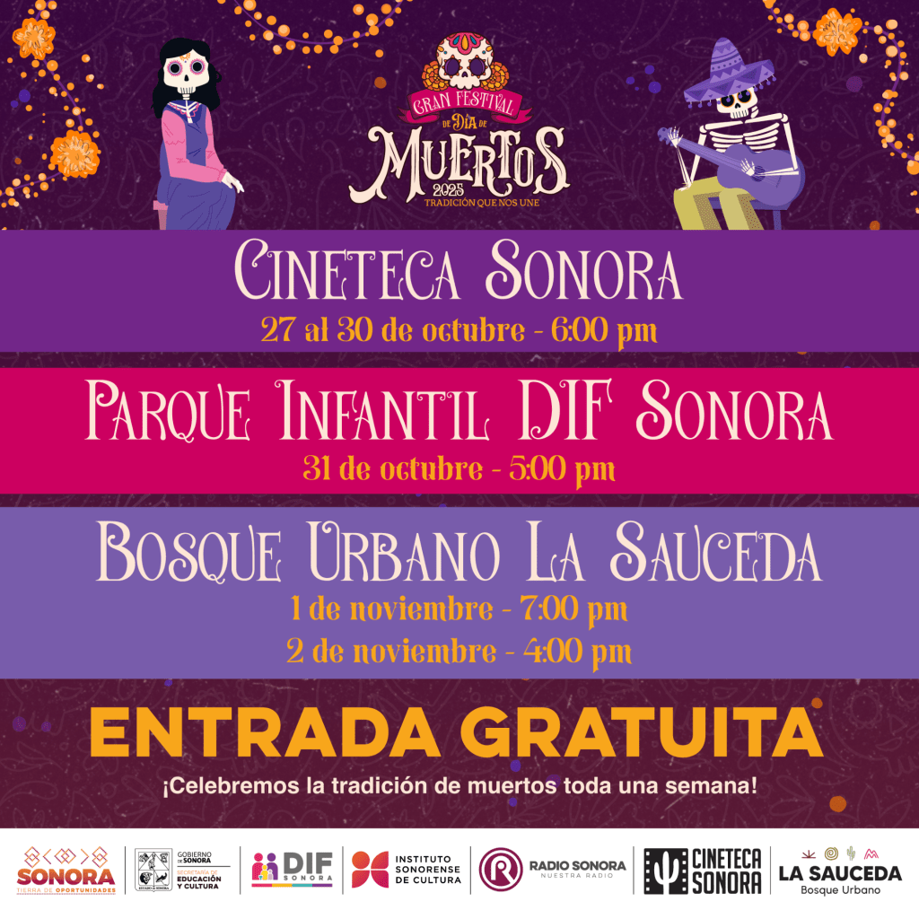 Martes 4 de noviembre: Procesión del Día de Muertos desde el Barrio Mágico de Villa de Seris hasta la Casa de la Cultura de Sonora con un colorido programa artístico a las 17:30 h.