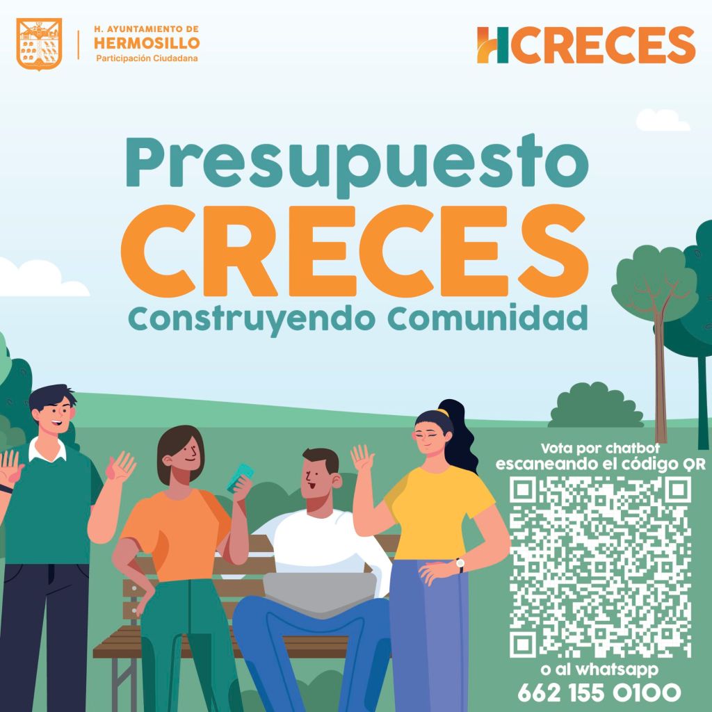 Publicado el noviembre 28, 2025 Presupuesto CRECES Construyendo Comunidad Hermosillo 2025 En la edición 2025, la bolsa de recursos se incrementará a 100 millones de pesos, con votaciones abiertas del 27 de octubre al 21 de noviembre pasado.La ciudadanía podrá participar de manera digital en la página presupuestocreces.hermosillo.gob.mx o vía WhatsApp en el chatbot “Hola” (662 155 0100). Comparte esto: Compartir en X (Se abre en una ventana nueva) X Comparte en Facebook (Se abre en una ventana nueva) Facebook Me gusta Cargando...