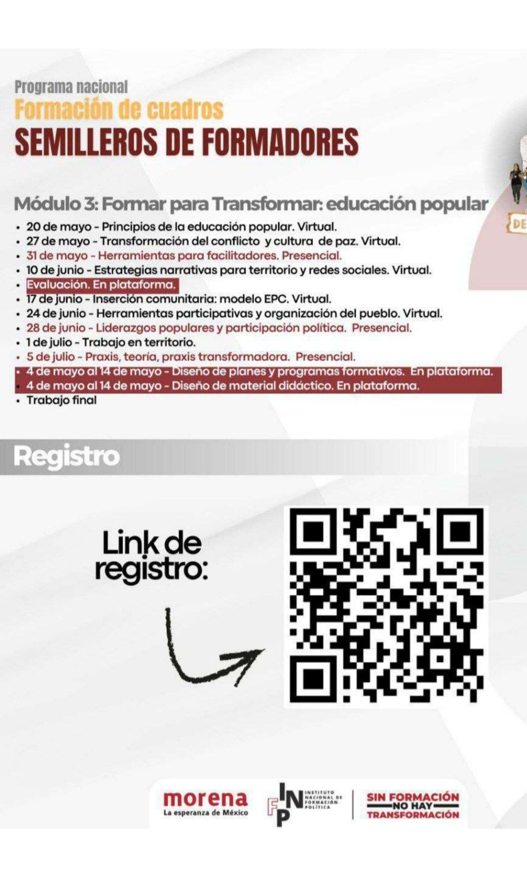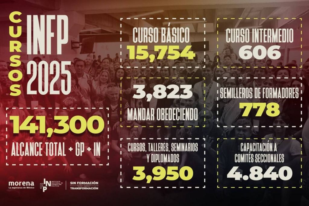 Con un alcance de más de 141 mil 300 participantes a los diversos cursos del Instituto Nacional de Formación Política INFP del partido-Movimiento de regeneración nacional MORENA en 2025, en las 32 entidades del país y el extranjero