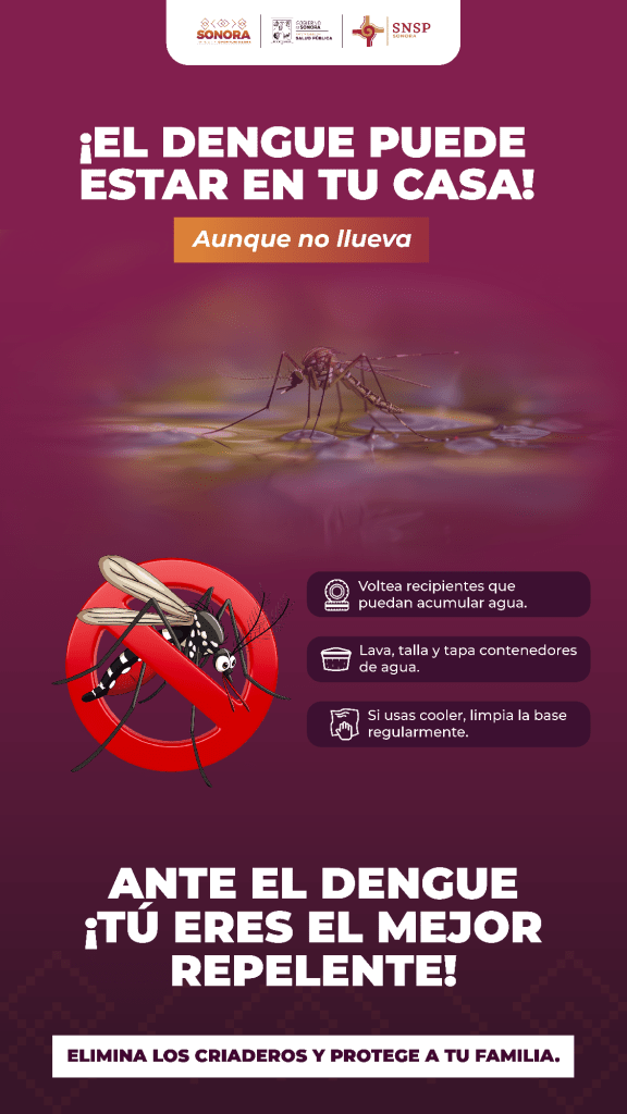 La dependencia estatal reiteró el llamado a la población sonorense a reforzar las medidas preventivas dentro del hogar, especialmente la eliminación de agua acumulada en patios, azoteas, contenedores y cualquier espacio que pueda funcionar como criadero.