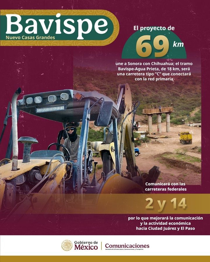La Secretaría de Infraestructura Comunicaciones y Transportes y el gobierno de México realizan la modernización de la carretera Bavispe-Nuevo Casas Grandes, para unir a Sonora con Chihuahua.