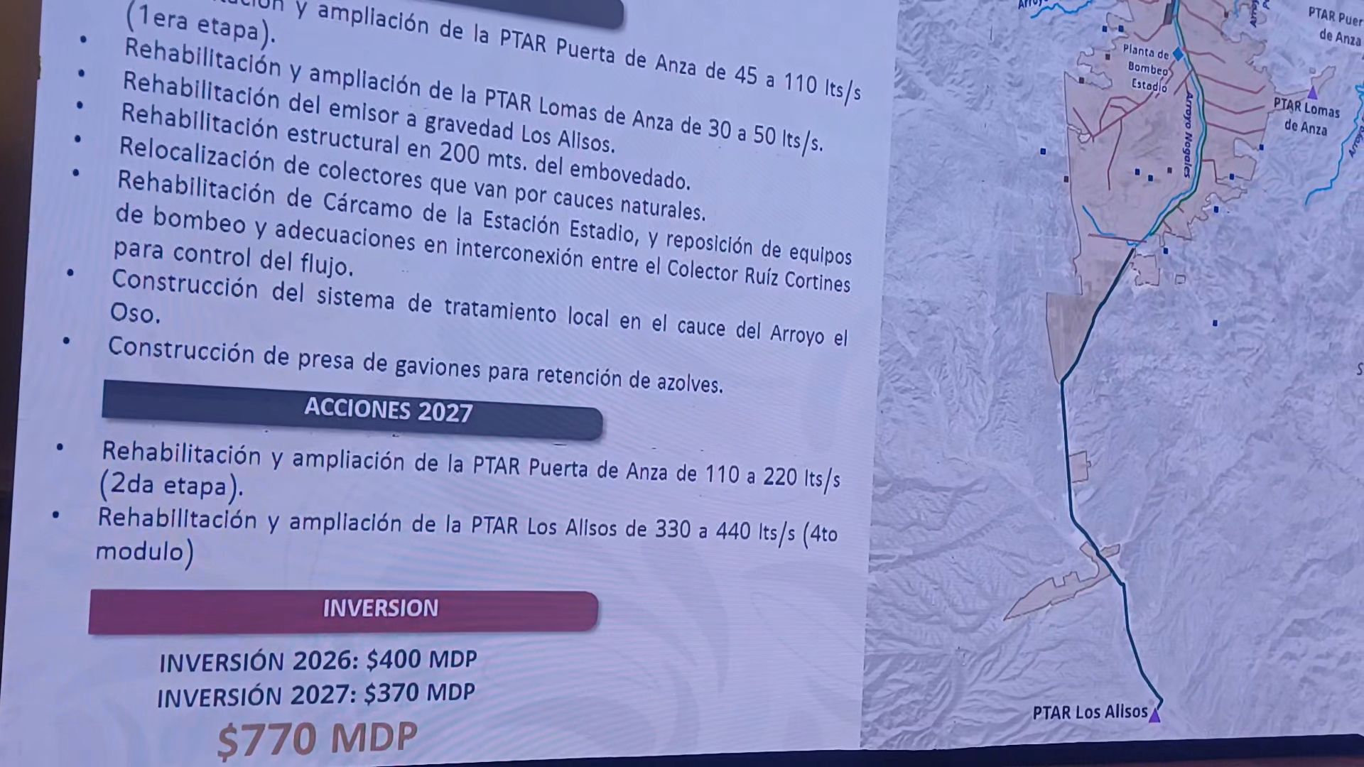 Hermosillo,Son, 24 de marzo de 2026.- Se está invirtiendo 770 mdp, 400 en 2026 y 370 en 2027 en el plan integral para sanear las aguas residuales en Nogales,anunció hoy en conferencia de prensa el gobernador Alfonso Durazo Montaño.