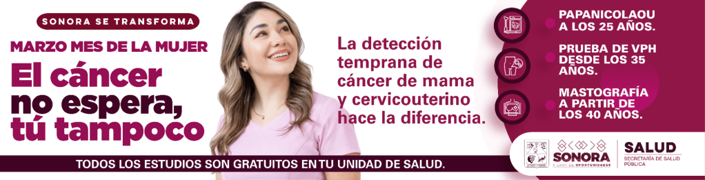 Publicado el marzo 31, 2026 Marzo mes de la mujer SECRETARIA DE SALUD La detección temprana de cáncer de mama y cervicouterino hace la diferencia.El cáncer no espera, tú tampoco…Sonora se transforma. Comparte esto: Compartir en X (Se abre en una ventana nueva) X Comparte en Facebook (Se abre en una ventana nueva) Facebook Me gusta Cargando...