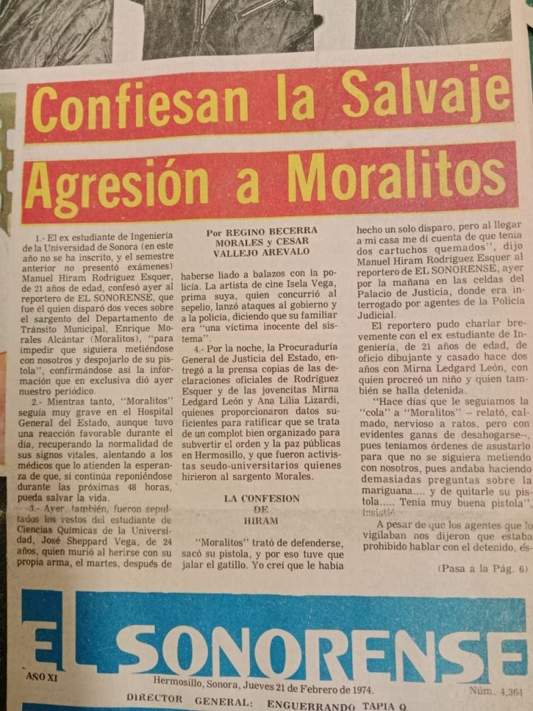 1.- El ex estudiante de Ingenieria de la Universidad de Sonora (en este año no se ha inscrito, y el semestre anterior no presentó exámenes) Manuel Hiram Rodriguez Esquer, de 21 años de edad, confesó ayer al reportero de EL SONORENSE, que fue él quien disparó dos veces sobre el sargento del Departamento de Tránsito Municipal, Enrique Morales Alcántar (Moralitos), para impedir que siguiera metiéndose con nosotros y despojarlo de su pistola». confirmándose asi la información que en exclusiva dió ayer nuestro periódico.